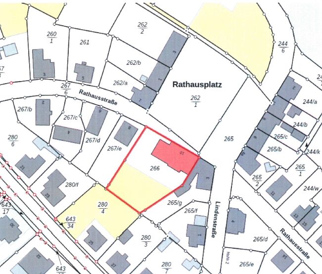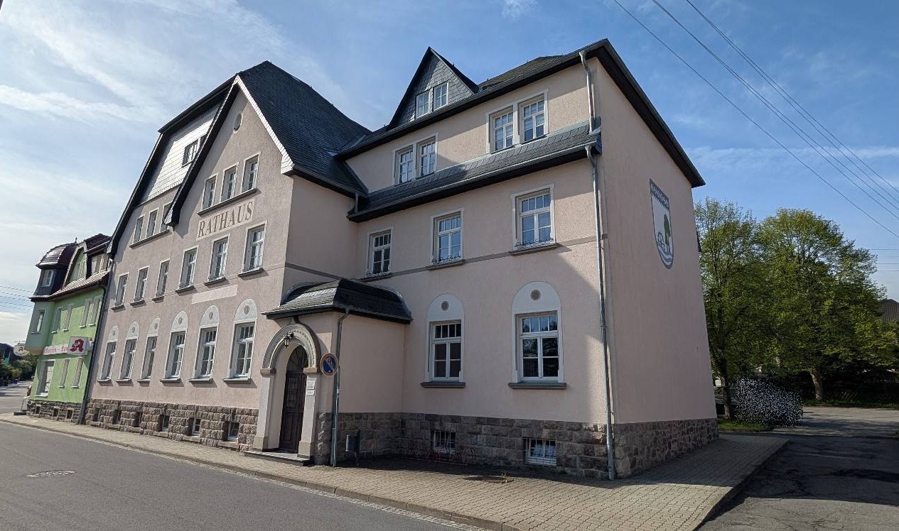 Zum Verkauf steht ein dreigeschossiges ehemaliges Verwaltungsgebäude (Rathaus). Das Gebäude ist denkmalgeschützt und zum Großteil leerstehend. An wenigen Räumen im Erdgeschoss besteht ein bis 10/2026 befristeter Mietvertrag. Für die im Objekt befindliche Bibliothek sowie weitere Bereiche des Erdgeschosses (Sitzungssaal, Toiletten) soll künftig ein Mietvertrag mit dem Käufer als neuem Eigentümer geschlossen werden. Das Gebäude ist unterkellert und verfügt über einen Strom-, Wasser- und Gasanschluss sowie einen Anschluss an die öffentliche Abwasserentsorgung. Das Dachgeschoss mit Ausnahme des Spitzbodens ist ausgebaut. Auf dem Grundstück befinden sich mehrere Pkw-Stellplätze.