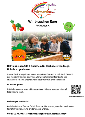 Die kleinen Gärtnerinnen und Gärtner der Kindertagesstätte „Knirpsenland“ Pockau möchten gern einen 500 Euro-Gutschein für Hochbeete und Pflanzkübel gewinnen. Unsere Kinder sind überzeugt, dass Karotten nicht im Supermarkt wachsen und möchten das nun selbst überprüfen. Mit einem Hochbeet könnten wir gemeinsam säen, gießen, beobachten und natürlich auch probieren. Die Kinder lernen dabei spielerisch, wo Lebensmittel herkommen und wie Pflanzen wachsen. Außerdem sind unsere Knirpse echte Gartenprofis: Buddeln können sie hervorragend und beim Gießen sind sie sehr engagiert (manchmal sogar etwas zu engagiert). Ein Hochbeet wäre für uns ein tolles Projekt zum Entdecken, Lernen und Staunen.